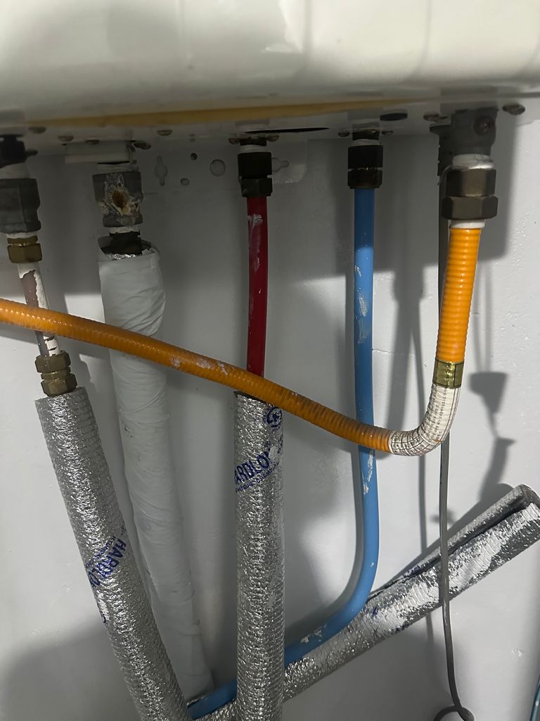 보통 밸브는 오른쪽 끝에있는 호스에 있는데 간혹 보일러통과 연결부위에있는게아니라 저 노란색 호스 따라서 보면 누가봐도 밸브처럼생긴게 있을거에요. 위치보아하니 위로 올려 고정시켜논것같아요