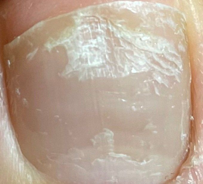 사진을 통해서 보았을 때에는 단순히 젤네일을 뜯으면서 손톱의 윗부분이 같이 벗겨져 나가면서 발생한 증상으로 보입니다. 손톱 건강을 위해 추가적인 네일 등은 하지 마시길 권고드리며 당분간 손톱 관리를 잘 해주시길 추천드립니다.