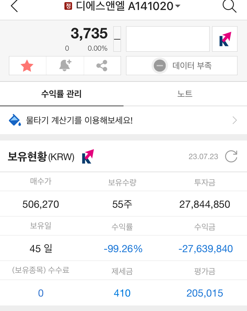 만약에 회사가 상장폐지가 발생하게 되면 정리매매기간을 7영업일을 주게 되요. 그런데 이 정리매매기간동안에는 대부분 거래정지가격의 가격에 80%가 하락한 수준에서 거래가 되다 보니 현재 가격대비 20% 수준으로 5만원정도가 될 것 같아 보이세요..