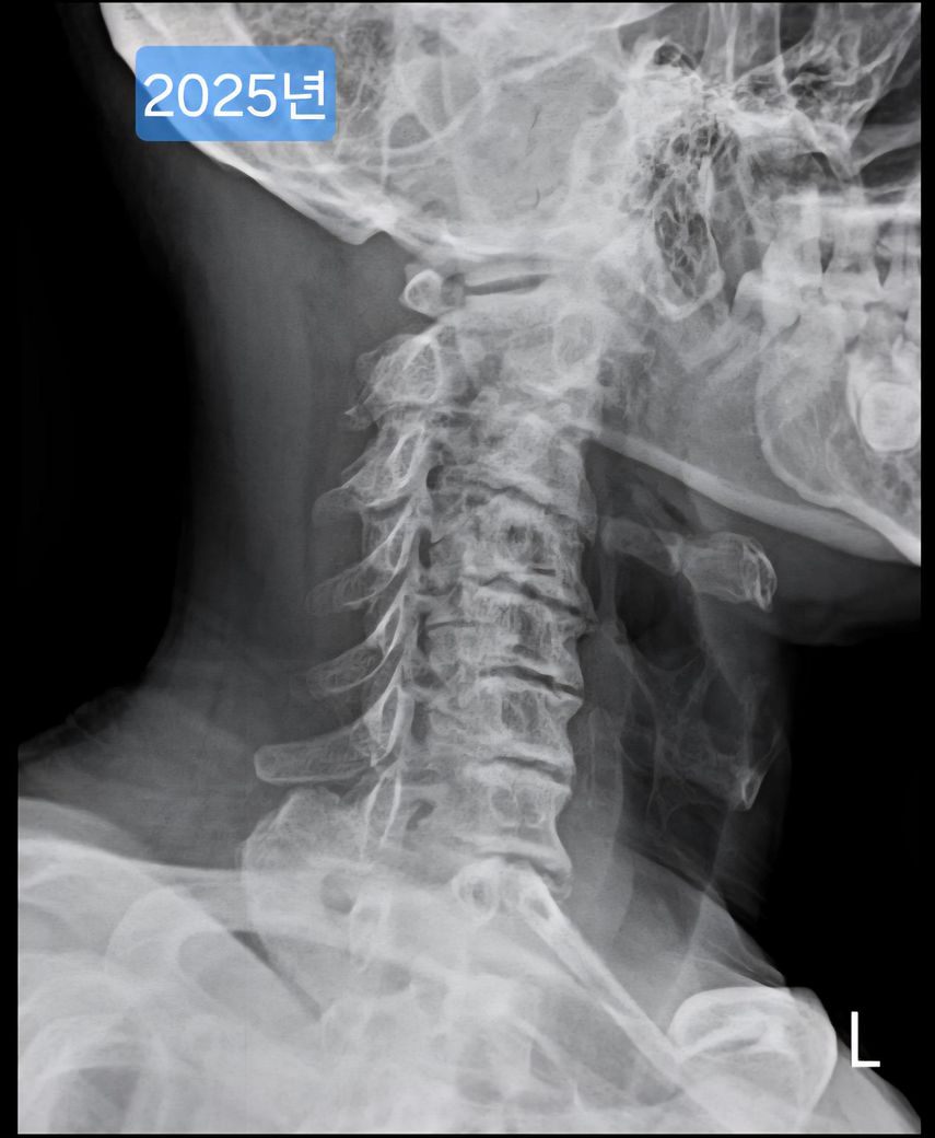 일자목, 경추사이 공간이 좁은 안좋은 형태의 목상태 입니다
