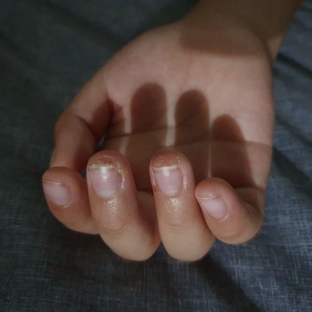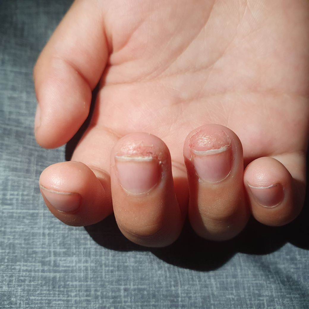 질문하신 내용에 대하여 아래와 같이 답변 드립니다.손톱을 물어뜯어서 피부질환이 생긴것처럼 보입니다.