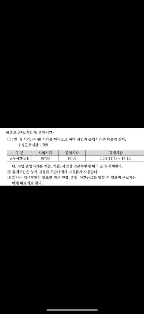 -단, 시업시간, 종업시간은 계절 ,직종,사업장, 업무 형편에 따라 조정 시행 한다.