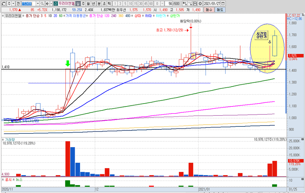 시간외 단일가에서 강력한 상한가를 가져간 종목이 다음날 시가 +14%대에서 위꼬리를 살짝 주더니만 그냥 하락을 해버렸다. 그것도 매물대 상단에서...