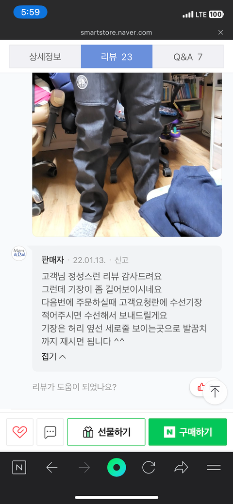 바지 구매전 건조기 사용해도 되는지 물음 -> 건조기 사용해도 된다는 답변 받음 ->딱맞춰 기장 수선의뢰 해서 구매 -> 건조기 사용 후 바지가 7센치가량 줄어들음 -> 판매자에게 항의 하였으나 건조기사용 부주의라며 거부 -> 제품 택과 라벨안쪽 확인결과 세탁후 기장을 수선해야하며 여유있게 기장 수선을 해야했음 그러나 이같은 사실 안내받지 못함 -> 다시 판매자에게 항의 -> 판매자는 거부하고 상세페이지 싹 수정