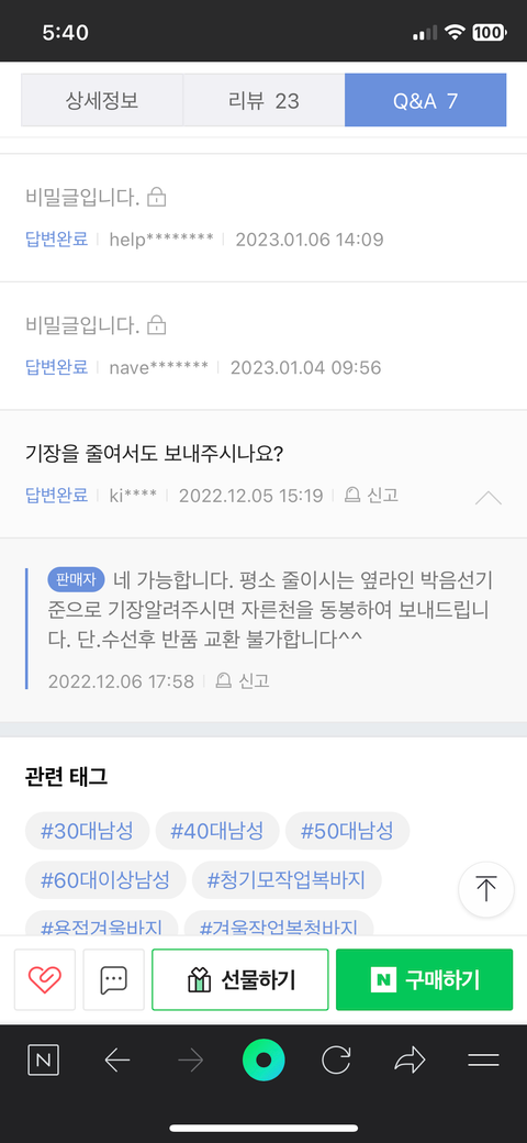 판매자가 상세 페이지에 무료 기장수선이라고 안내를 하고 있어서 건조기를 사용하면 기장 변형이 있는지 물었습니다