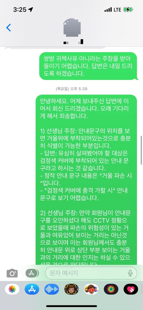 쟁점은, 저는 검정색 커버 뒤 거울이 있다는 안내 문구가 없었다는 입장이며, 헬스장 측은 거울과 여유 있는 거리 아니므로 제가 주의했어야 했다는 입장입니다.
