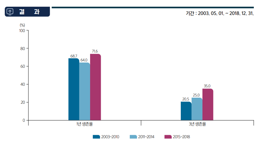 1년 생존율은 71.6%, 3년 생존율은 35%입니다.