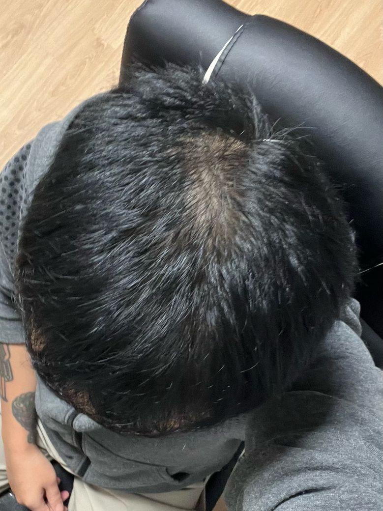 사진만으로 단정은 어렵지만, 말씀하신 내용(모발 굵기 감소, 숱 감소 느낌)을 보면 남성형 탈모 초기 가능성은 배제하기 어렵습니다. 특히 모발이 가늘어지는 변화는 초기 탈모에서 흔합니다.