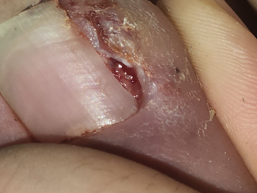 사진에 보이는게 왼쪽 엄지발가락인데요, 발톱을 세로로 깊게 자른 부위에 이상한 염증같은게 보이는데 육아종이 아직남아있는건가요? 발톱을 사진과 같이 자르고 육아종을 떼어내는 수술을 했습니다만, 발가락의 감아놓은 밴드를 떼어내니 육아종이 남아있는것 같은 느낌이 들어 질문을 해봅니다. 참고로 저는 양발 엄지발가락 모두 내성발톱이고, 이러한 처치를 10회이상 받아보았고 대부분이 육아종이 다시 자라났었습니다. 오른쪽 엄지발가락은 아예 발톱을 떼어내기도 하였습니다.