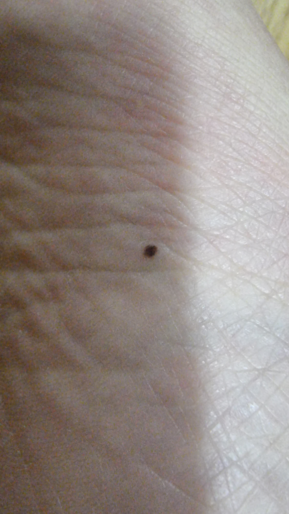 사진 소견을 통해서 미뤄 보았을 때에는 점의 모양이 딱히 찌그러져 있지 않으며, 점의 경계가 불분명하지 않고, 점이 튀어나온 양상도 아니기 때문에 흑색종 피부암을 의심해볼 수 있는 소견들이 따로 보이지 않습니다. 흑색종 피부암의 가능성은 매우 낮아 보이며, 단순한 색소 침착, 즉, 점일 가능성이 가장 높아 보입니다. 그렇지만 사진의 소견으로는 어디까지나 가능성을 보는 것일 뿐 피부의 외관적인 소견만 가지고 완전하게 감별 및 배제할 수 없기 때문에 걱정되신다면 피부과에서 조직 검사를 받아보시는 것이 가장 안전한 방법입니다.