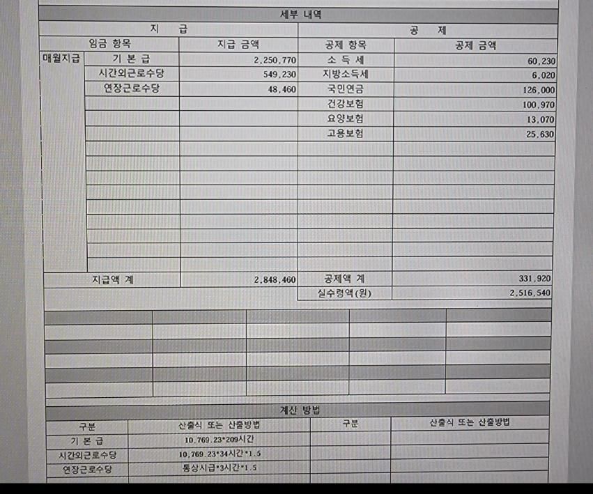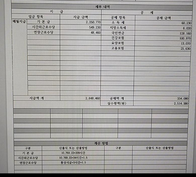 첨부된 급여명세표 밑에 보시면 기본급이 시급 10,769원 * 209시간으로 설정되어 있기 때문에 기본급에 월 주휴수당이 포함되어 지급된 것입니다.(주휴수당 및 최저임금 위반이 없습니다.)
