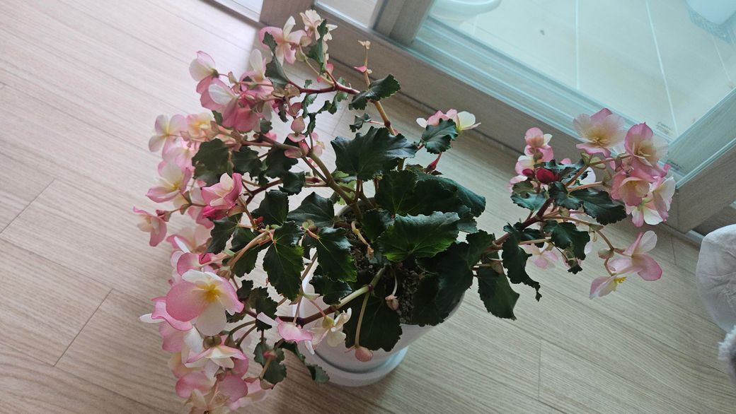 장미베고니아 너무 잘 키우셨네요 줄기가 쳐진 이유는 물이 부족해서 그럴 수도 있지만 첫 번째는 꽃을 너무 많이 피우다 보니 무게가 있어서 처진 것 같습니다