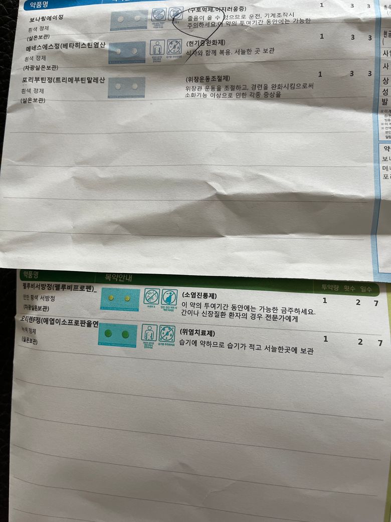 오늘 무릎통증으로 약처방받아서 두개다 먹어도 될지궁금하고, 어지러움 약이 항생제가 아닌 것같아서 증상괜찮아지면 중간에 처방약복용 중단해도되나요??