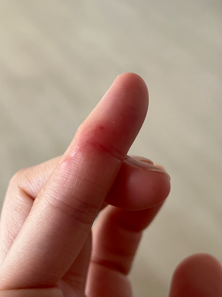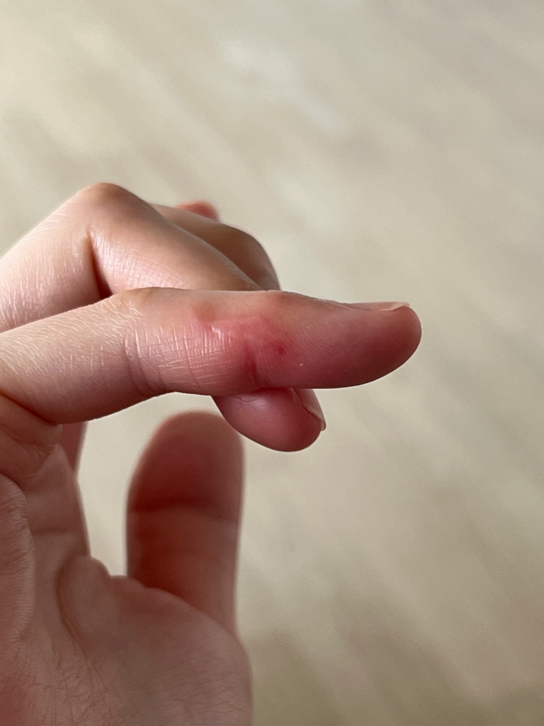 사진으로 보아 손가락 끝 부위가 붉게 부어 있고, 가려움과 이질감이 있는 것으로 보입니다.