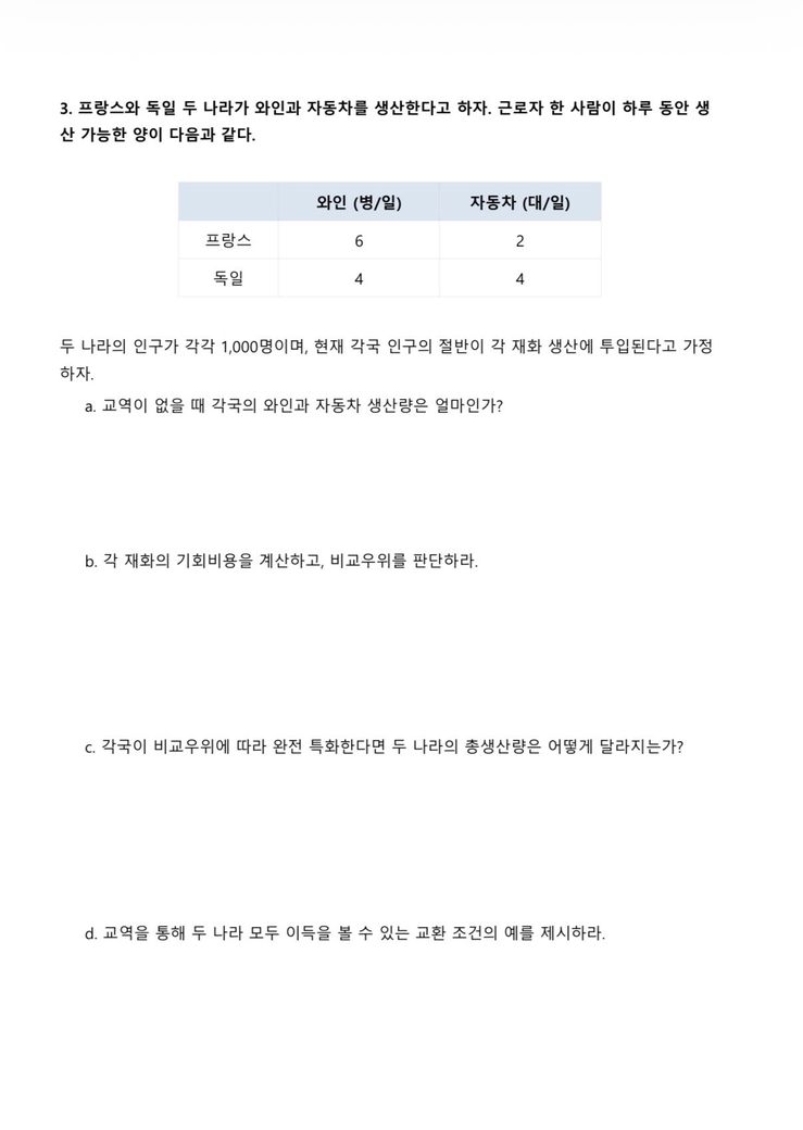 두국가 모두 총생산량이 증가하게 되며, 이는 각 국가의 재화별 생산량을 확인하시면 알 수 있습니다. 요컨데, 결국 자신이 못하는 것을 포기하고 잘하는 것에 집중하면 전체 무역의 입장에서 효익이 증가하고 생산량이 증가하게 된다고 보시면 됩니다.