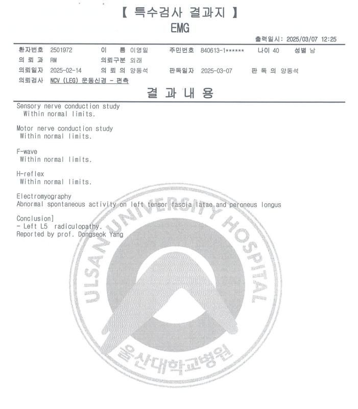 그런데 근전도 결과지는 없어서 근전도 결과지를 한번 잘 찾아보시기 바랍니다.
