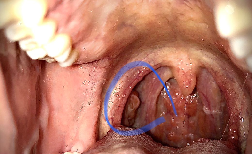 현재 사진만으로 정확하진 않으나 편도 부위 염증 혹은 종괴로 보이는 소견이 있어 이비인후과에 내원하시어 진료를 받으시는 것이 좋겠습니다.