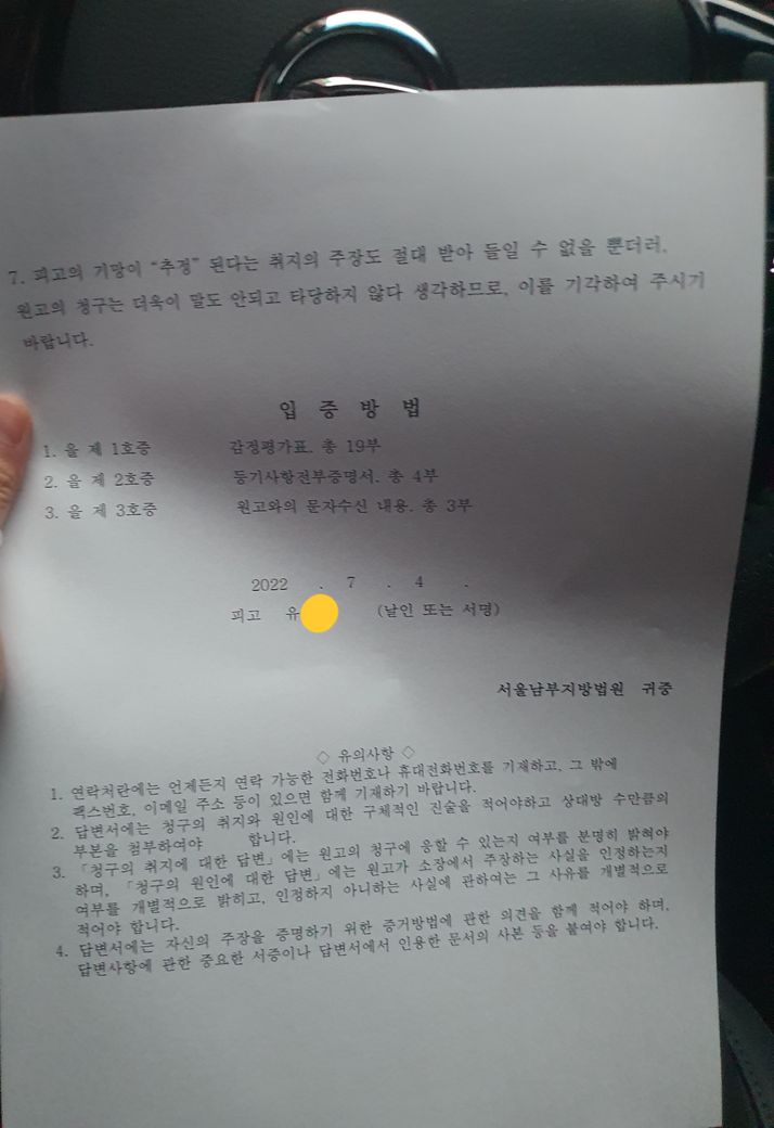 위의 소장에 대해 아래 사진과 같이 답변서 작성 하여 제출하였고 변론기일이 9월로 잡혔습니다.