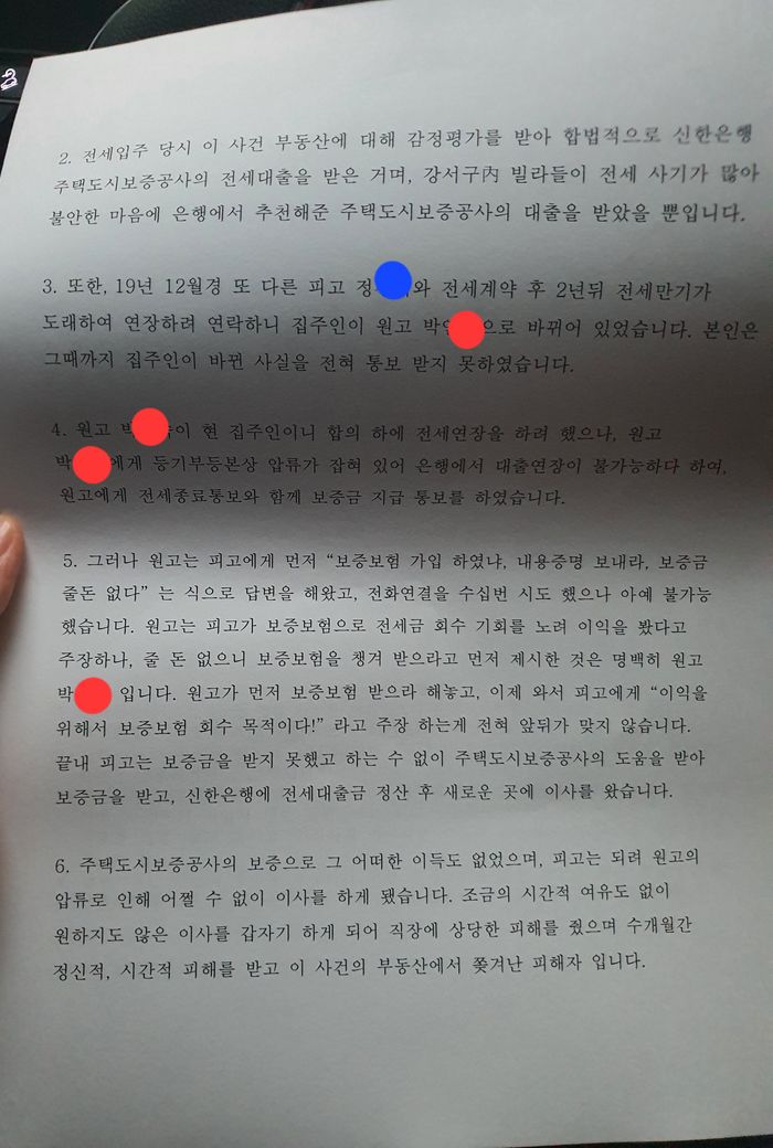 주택도시보증대출을 받아 보증금 일부를 부동산 업자들과 다른 피고 정xx과 글쓴이가 나눈 것으로 추정 된다.