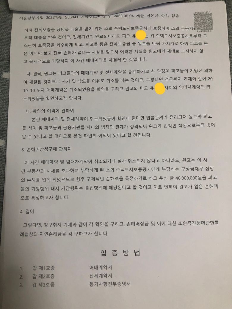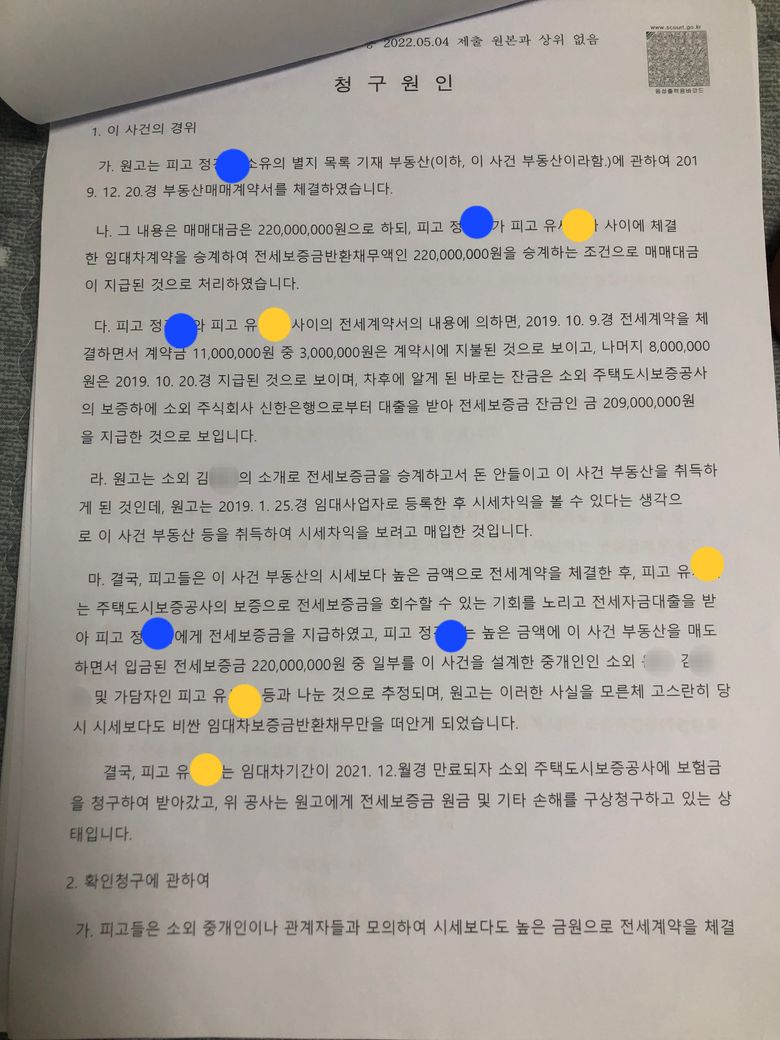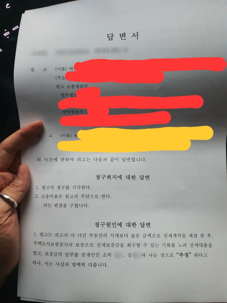 글쓴이와 또 다른 피고 정xx가 짜고 시세보다 높은 금액으로 전세 계약 체결했다.