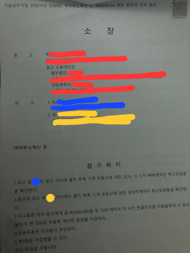 빨강색 = 원고(집주인)