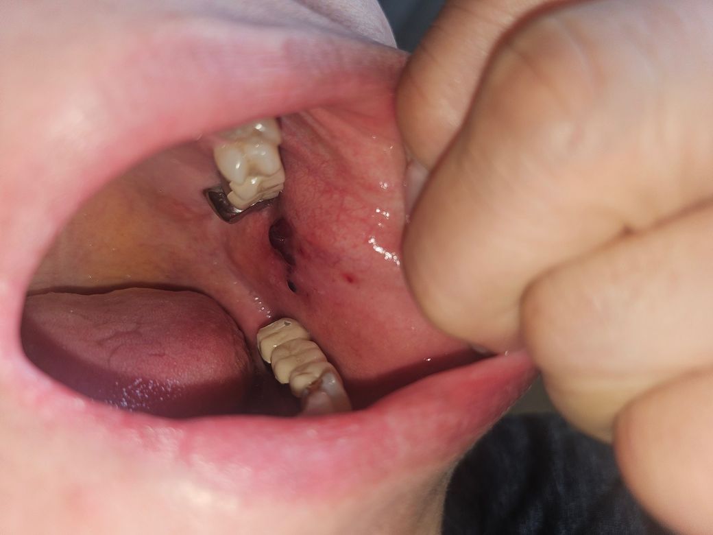올려주신 사진으로 미루어 음식물을 씹는 과정에서 점막이 같이 씹혀 생긴 상처로 생각됩니다.