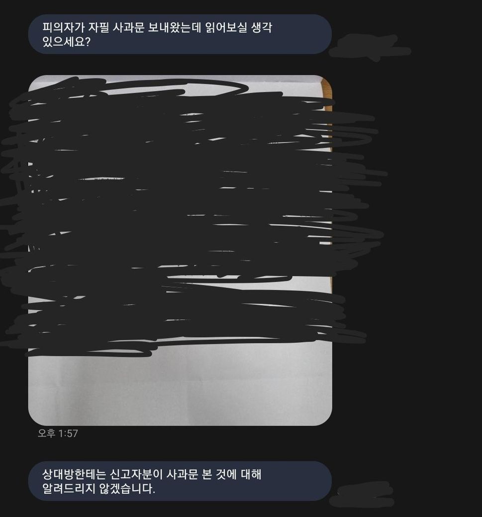 저는 무서워서 제가 이 사과문을 읽었는지, 어떻게 반응했는지를 피의자가 확인할 수 없도록 비밀유지를 원했었습니다.
