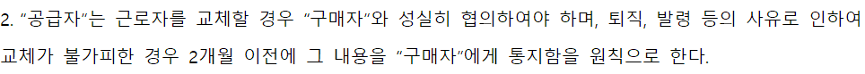 2. “공급자”는 근로자를 교체할 경우 “구매자”와 성실히 협의하여야 하며, 퇴직, 발령 등의 사유로 인하여 교체가 불가피한 경우 2개월 이전에 그 내용을 “구매자”에게 통지함을 원칙으로 한다.