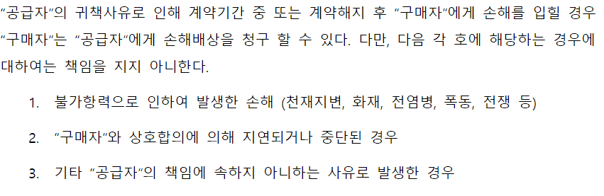 “공급자”의 귀책사유로 인해 계약기간 중 또는 계약해지 후 “구매자”에게 손해를 입힐 경우 “구매자”는 “공급자”에게 손해배상을 청구 할 수 있다. 다만, 다음 각 호에 해당하는 경우에 대하여는 책임을 지지 아니한다.