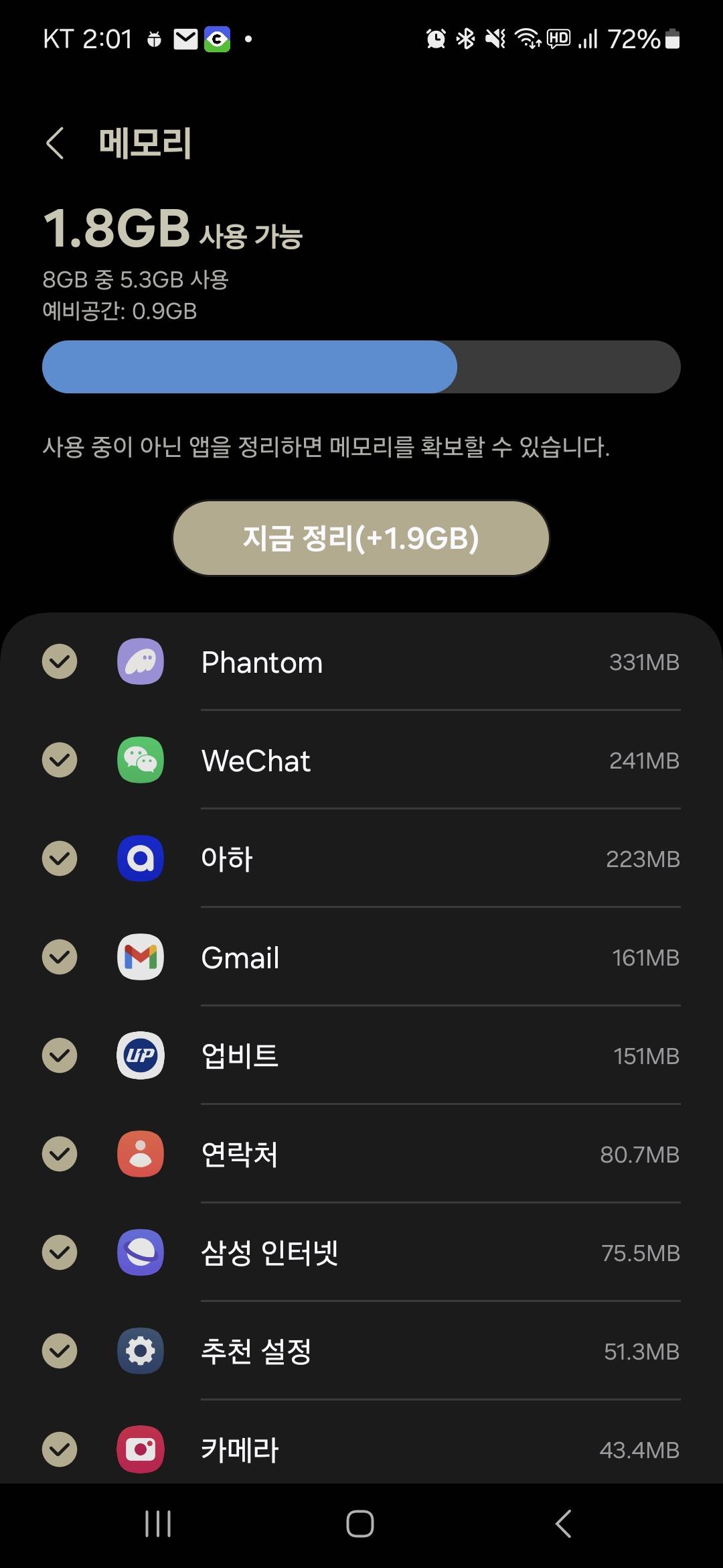 위에 사진처럼 현재 차지하고 있는 핸드폰 메모리 입니다. 앱을 설치하시면, 실행을 안해도 위쳇 처럼 나도 모르게 네트워크를 사용하고 사진처럼 시스템에서 메모리를 사용하고 있습니다. 대부분에 앱은 실행 전 동작을 안하고 시스템 메모리를 차지하지 않아요. 하지만 실시간으로 정보를 전달하는 앱들은 대부분 실행과 상관없이 핸드폰이 켜지면 자동으로 실행 됩니다. 그렇기 때문에 꼭 필요한 앱이 아니면 삭제해서 부하을 줄여주는게 방법이긴 합니다.