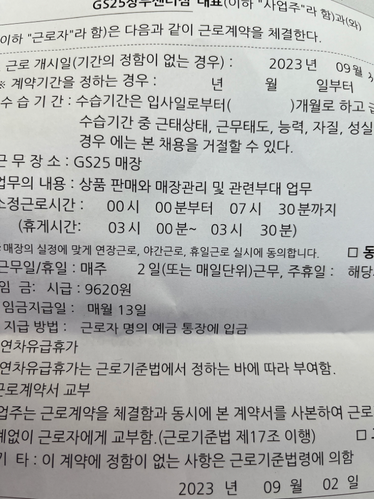 2. 계약서상 휴게시간에 실제 일을 한 사실에 대한 증거자료를 모아 놓으시길 바랍니다.(영수증을 모으는것도 좋은 방법입니다.)