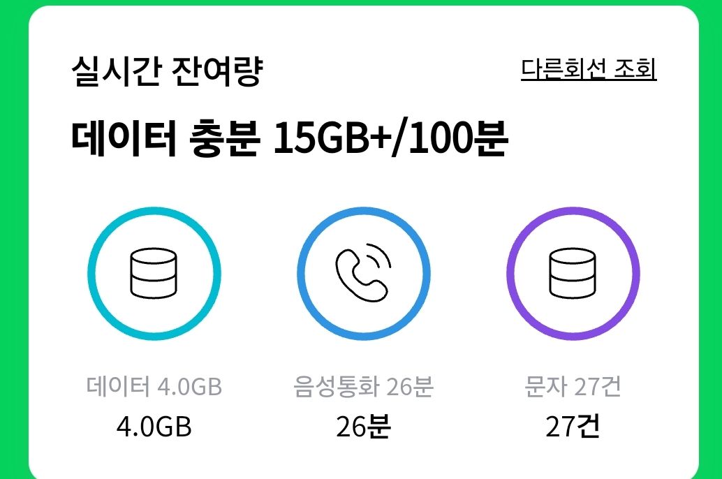 내가 좋아하는 라면은 너구리입니다.15GB플러스 100분은 님요금제 데이터 사용가는한것이 15GB라고하는것이구요.통화는 100분만 무료라는것입니다.무제한이 아니에요.4GB는 님이지금까지 사용한 데이터구요.26분은 지금까지 26분통화했다는것입니다