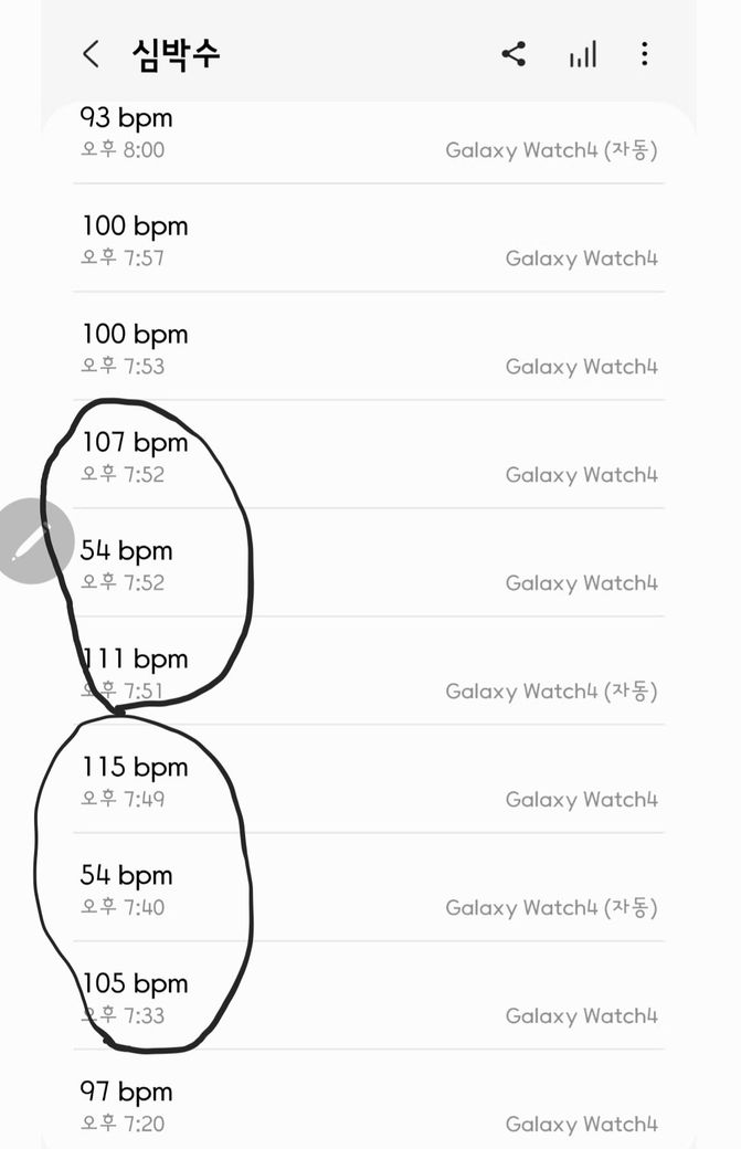 또 아래 첨부한 사진처럼 오늘은 1분사이에 50이였다가 100이넘어가서 너무 놀랬네요 정말 심장에 큰문제가 있는건지...무섭습니다
