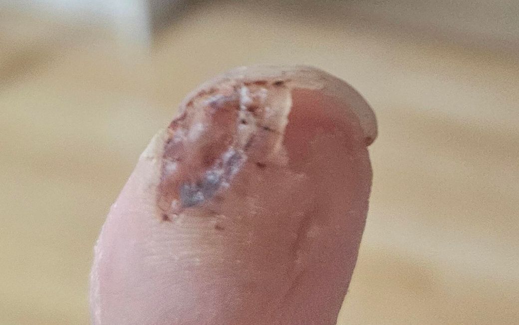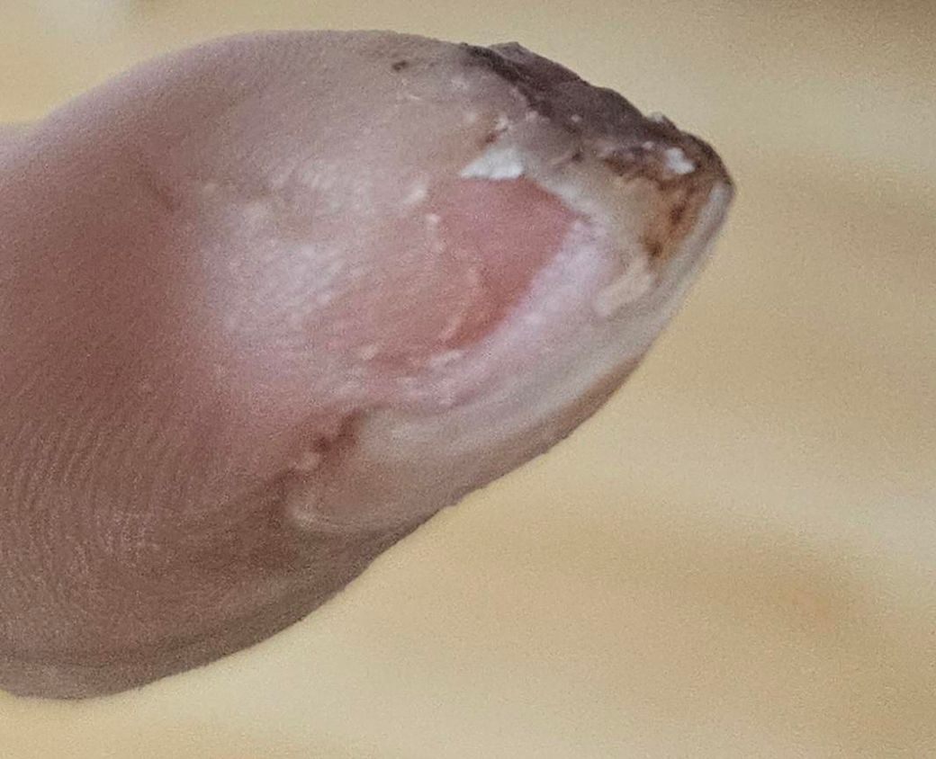 때가 너무 많아서 벗겼더니 사진처럼 이식한 피부랑 붙어있길래 더 이상 떼진 않았습니다.