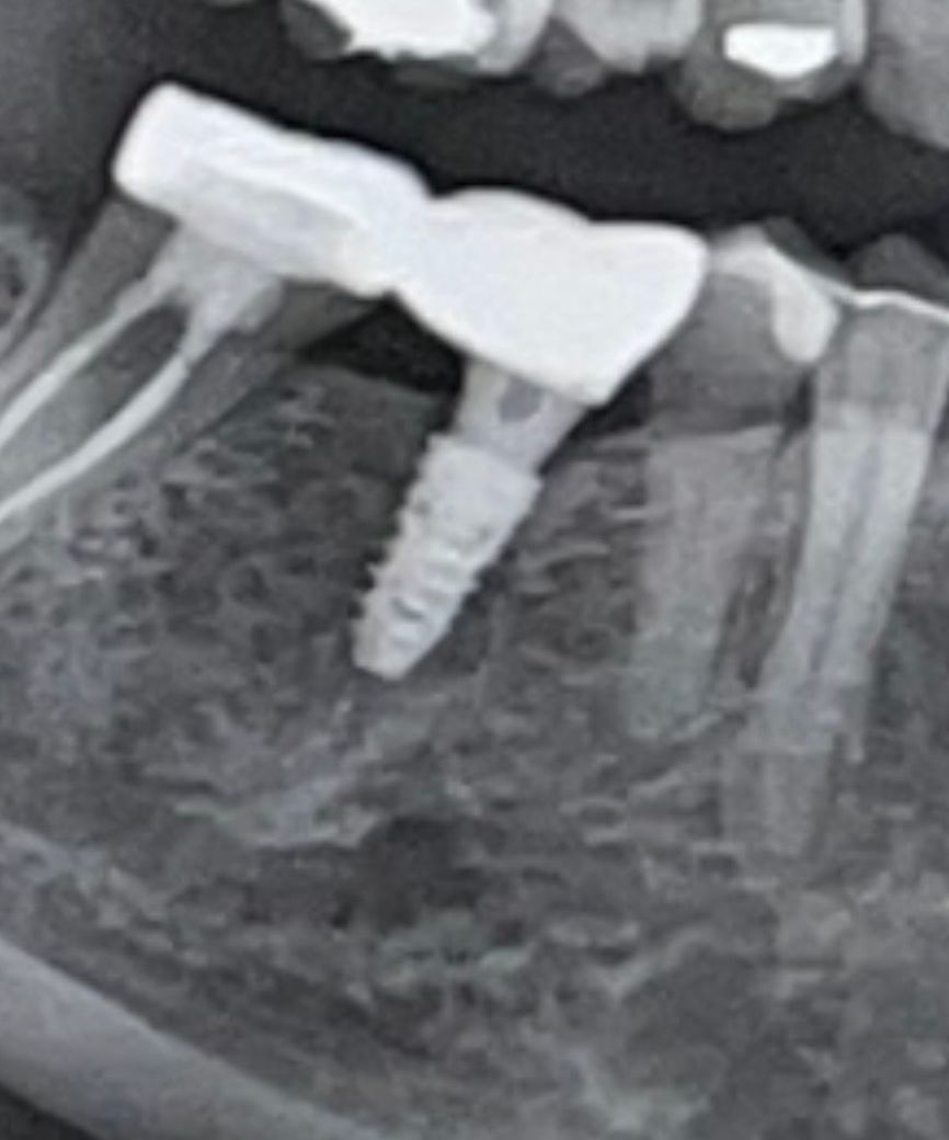 임플란트 뿌리 주변에 뼈가 손실된 것으로 보입니다. 특별한 불편감이 없다면 임플란트에 너무 강하지 않은 힘을 작용해서 사용하는 방법이 있습니다. 불편감이 있다면 임플란트 뿌리가 탈락된 것일 수 있으니 재수술이 필요할 수도 있습니다