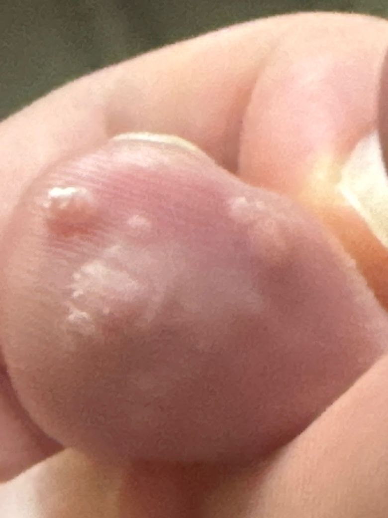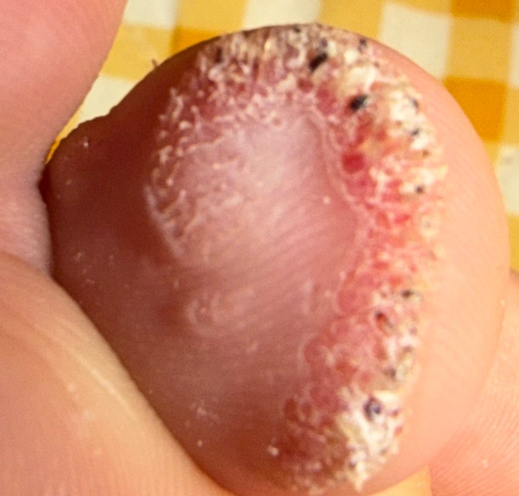 사진처럼 사마귀가 올라와 냉동치료를 받았고, 병원에서 치가 차면 터트려 피를 빼라고 말씀하셔서 피를 빼낸 적이 있고 이후 자연스럽게 아물어가더니 각질처럼 경계가 생기기 시작했습니다