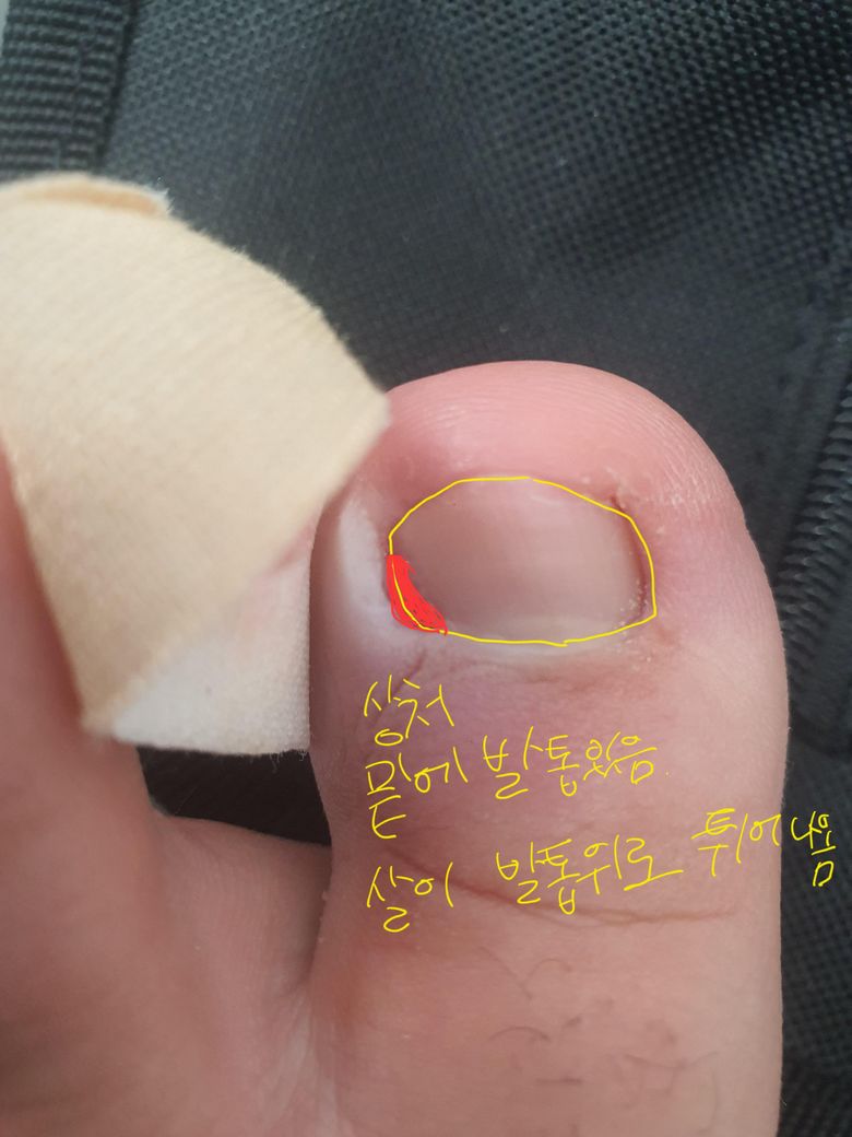 일주일 전 발톱을 자르다 너무 짧게 잘라버리는 바람에 발톱 안쪽 살이 다쳤었습니다.