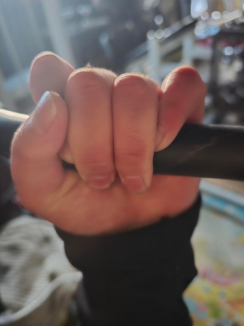 사진을 보면 봉을 잡을때 새끼 손가락이 옆으로 약간 벌어지면서 말리는 형태로 보이며 바를 잡을 때는 손가락 마다 힘을 고르게 써주시는게 좋으며 새끼손가락은 길이가 짧고 힘줄 방향이 약간 바깥쪽으로 향해 있어서 강하게 쥐면 옆으로 살짝 돌아가거나 다른 손가락 아래로 말리는 형태가 자주 발생할 수 있기에 주의 하시면서 잡아보시면 좋을 것 같습니다.