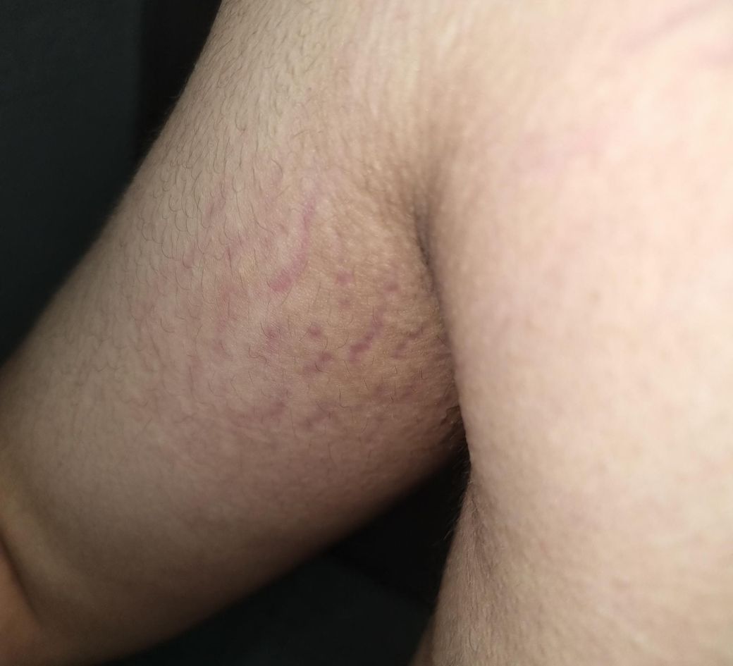 사진에서 보이는 보라색 선과 점 모양 병변은 형태상 초기 튼살(팽창선) 가능성이 가장 높습니다. 체중 증가, 근육 증가, 또는 급격한 체형 변화가 있을 때 진피층이 늘어나면서 콜라겐 섬유가 미세하게 파열되어 발생합니다. 초기에는 붉거나 보라색으로 보이며 시간이 지나면 점차 옅어져 흰색 선으로 변하는 경향이 있습니다. 가슴 옆, 겨드랑이 인접 부위, 팔 안쪽, 허벅지 등에 흔하게 나타납니다.