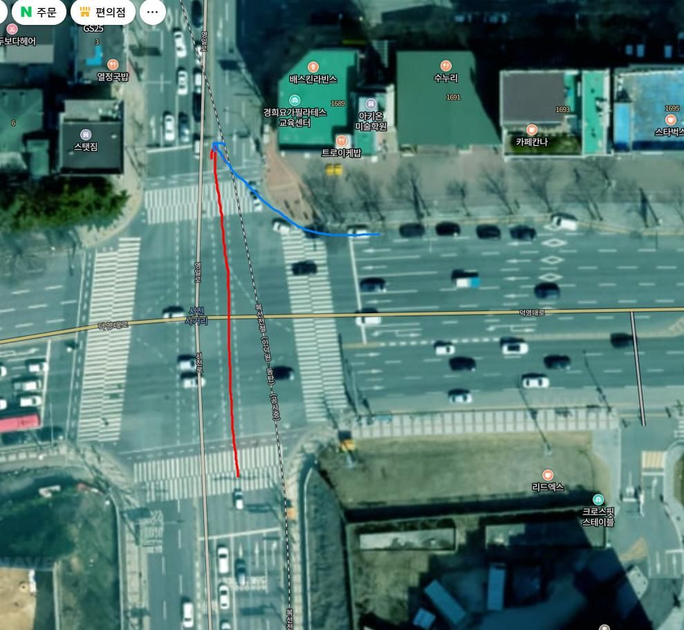 이때 우측 도로에서 우회전한 차량이 정상적으로 3→2차선을 거치지 않고 바로 1차선으로 진입하면서 제 차량 오른쪽 뒤를 충돌한 사고입니다.