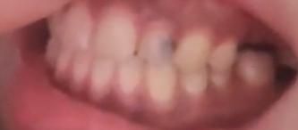 단순 착색이나 변색의 양상은 아니고 내부에서 충치가 진행되었거나 입천장쪽 충치인 것 같습니다 치과에서 충치검진을 받아보시기 바랍니다
