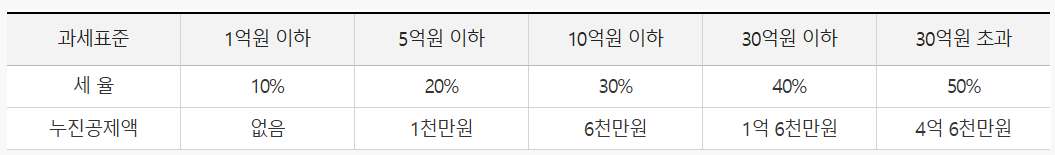 증여세율은 과세표준 구간에 따라 10%~50%가 적용됩니다. 1억 이하는 10%,5억 이하는 20%, 10억 이하는 30%, 30억 이하는 40%,30억 초과는 50%가 적용됩니다.