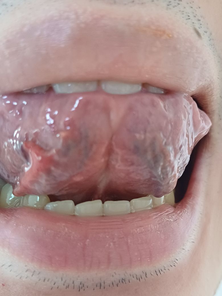 사진 좌측을 보시면 혀 밑 한쪽만 붉게 부어올랐습니다.