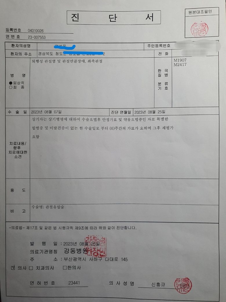 첨부파일은 어머니 수술진단서에 표준질병코드 (M1907 M2417) 있습니다.