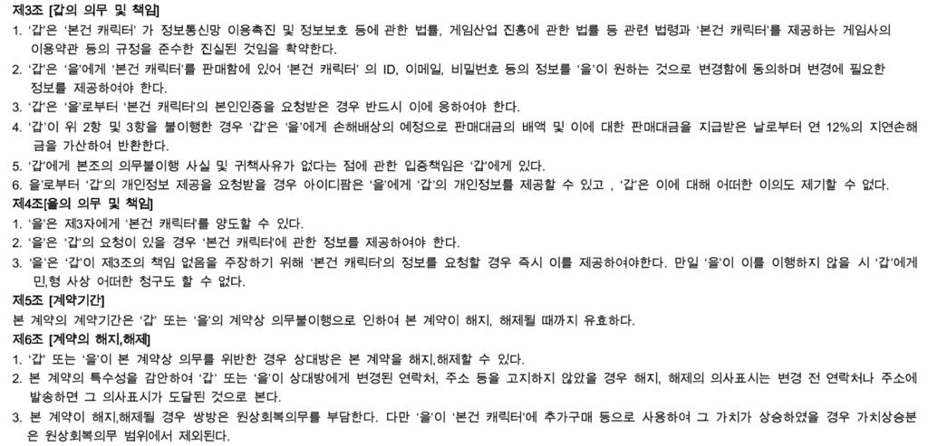 또 마지막으로 '안녕하세요 아이디 판매 했던 사람입니다 잘 하고 계시는지요? 제가 처음으로 애정있게 키웠던 캐릭이라 그런지 조금 궁금하네요' 라고 연락이 온 경우 제4조 2항에 명시 되어있는 '갑'의 요청으로 볼 수 있나요? 정보 제공을 해줘야 하는 연락이 맞나요?