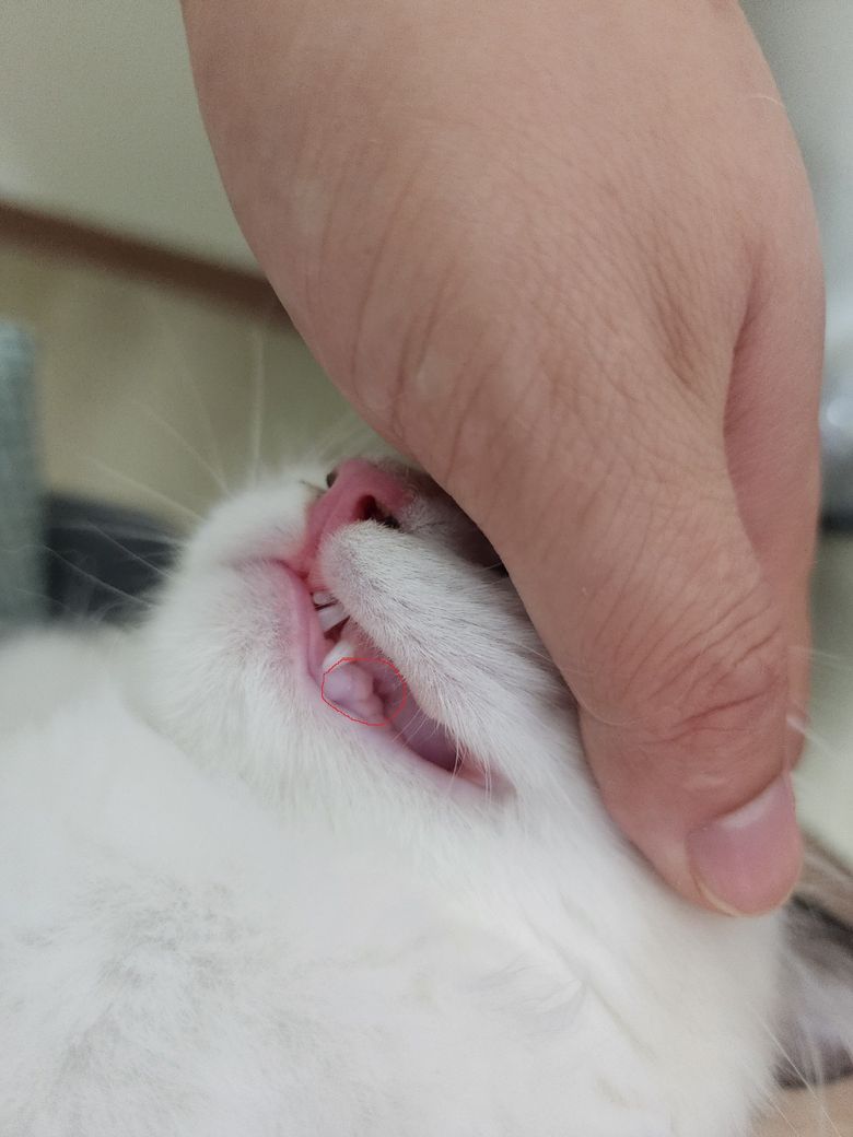 그리고 사진에 동그라미친곳(위쪽 송곳이 아랫부분?)이 하얗게 부풀어있는데 이빨이 아직 안난건가요?