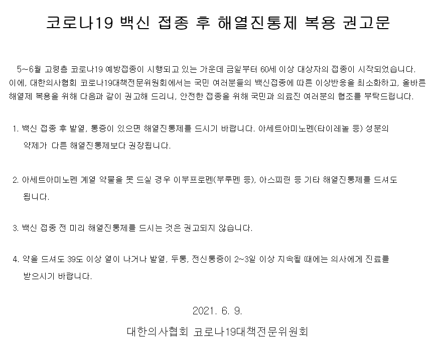 접종 전 아세트아미노펜 복용에 대해서는 새로운 가이드라인에서는 권장하지 않고 있습니다. 증상 발생시 해열제 (타이레놀과 같은 아세트아미노펜 계열)을 복용하시고, 복용 후에도 증상이 지속될 경우에는 내원하시어 추가적인 진찰 및 치료를 받으시는 것을 권유드립니다. 일반적으로 발열, 근육통, 두통이나 접종 부위의 국소적인 증상은 3일 정도 지속되며 대부분 1주 이내 호전됩니다.