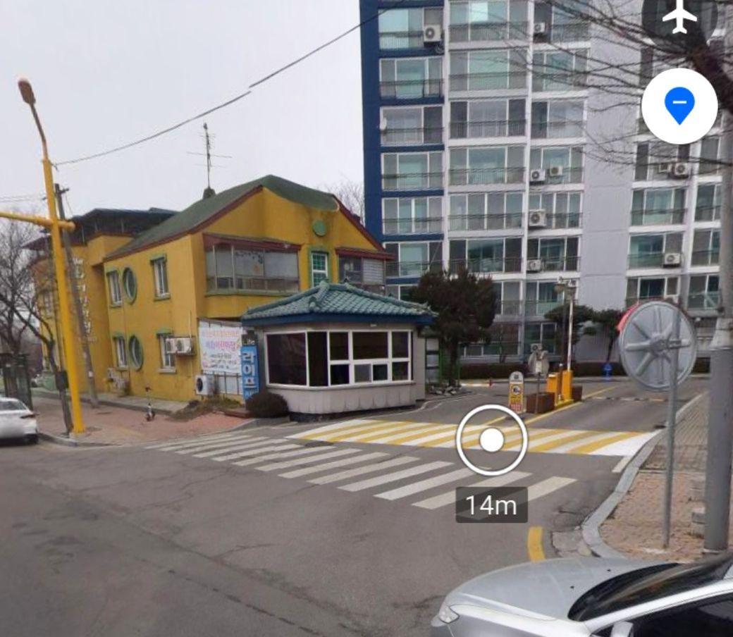 저는 사진기준 9시 방향인 유치원 앞에서 3시 방향으로 횡단보도를 건너는 중이였고 사고 차량은 1시방향 아파트에서 나오는 중이였습니다.