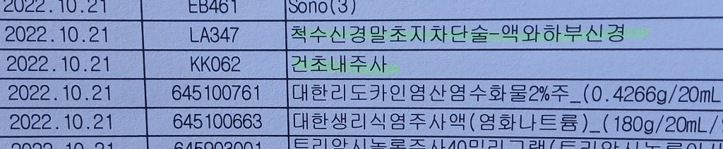 형광펜으로 표시한 아래쪽으로 보시면 리도카인 및 트리암 주사를 맞으신것 같습니다.