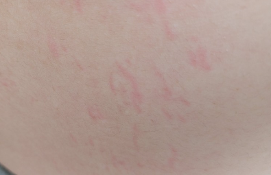 간지럽지도, 아프지도 않고 다만 빨간 모양대로 세로로 약간의 부어오름은 좀 보입니다.